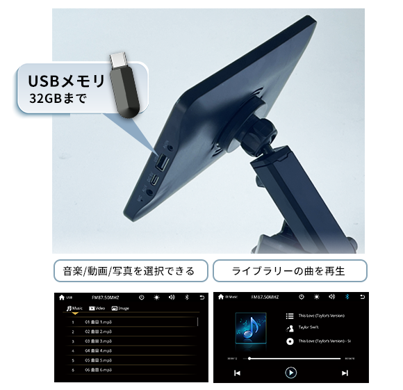 USBモードを選択して、音楽やビデオを再生したり、画像を見たりすることができます。32GBまでのUSBメモリをお勧めします。