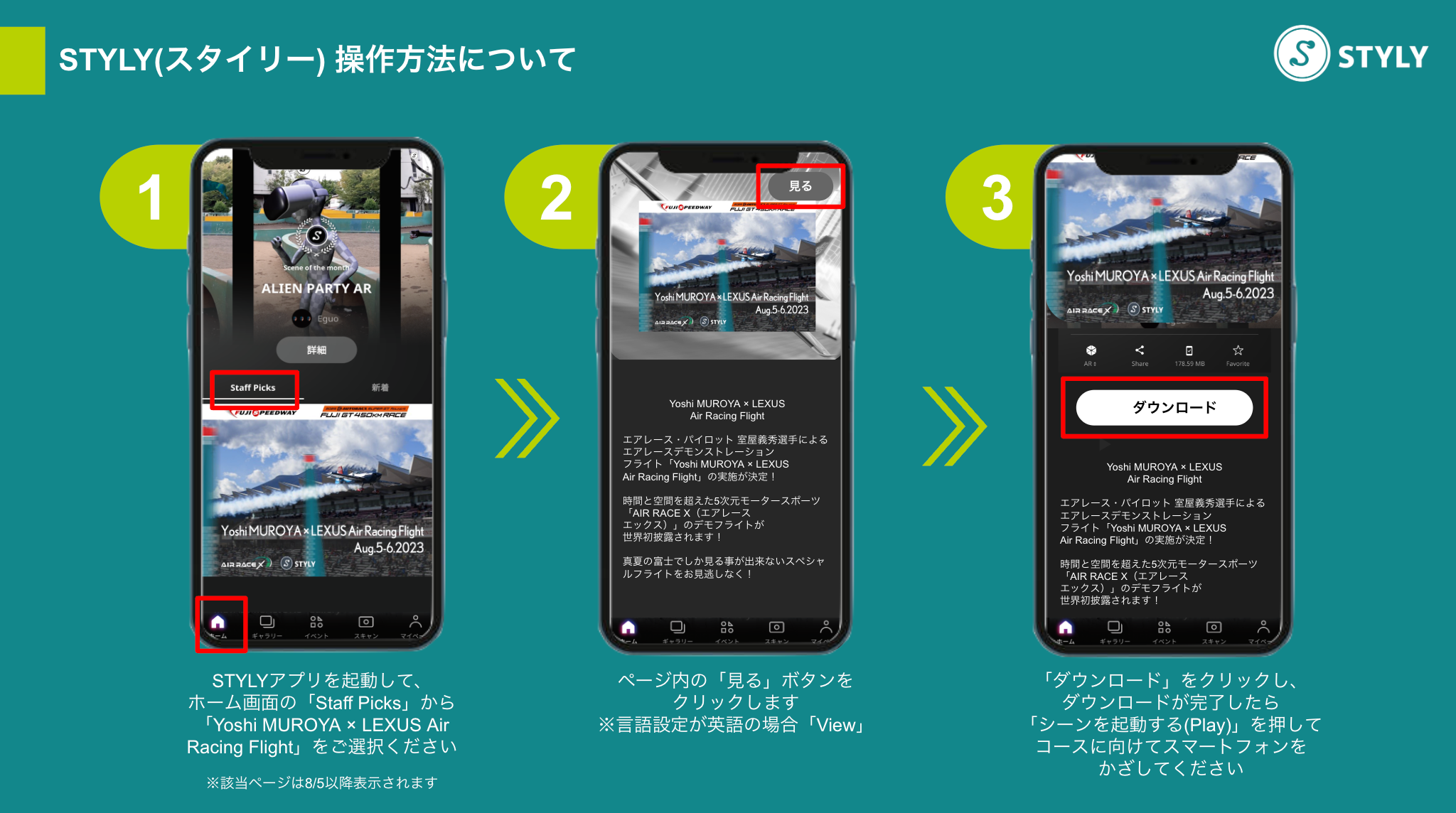 場内でAIR RACE X デモフライトをより楽しめるよう、スマートフォンアプリ「STYLY」でデジタルパイロンを出現させることが可能です。イベント当日デモフライトに合わせてアプリケーション内の専用ページが立ち上がりますので、事前のアプリインストールを推奨します。
