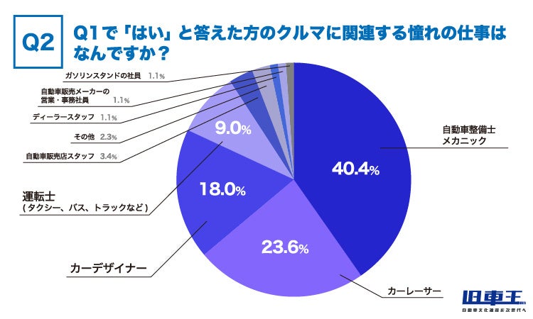 ・調査内容: Q1.これまでに、クルマに関連する職業に憧れを持ったことはありますか?Q2.Q1で「はい」と答えた方の、クルマに関連する憧れの仕事はなんですか?Q3.その理由を教えてください。Q4.Q1で「いいえ」と答えた方の理由を教えてください。