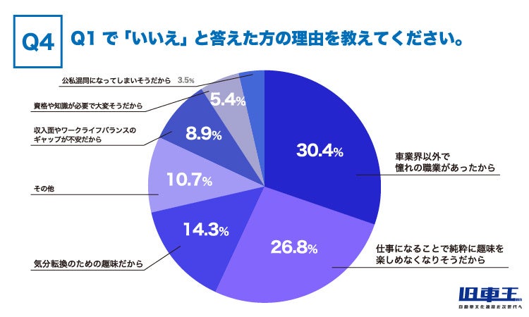 「いいえ」と回答した方の理由について聞いてみると、最も多かった回答が「車業界以外で憧れの職業があったから」で30.4%でした。