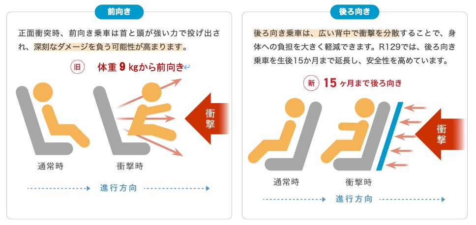 正面衝突時に前向きだと、体重の20%~30%の重さを占める頭が強い力で前方へ投げ出され、頸椎や脊椎に重篤なダメージを負ってしまいます。一方で、後ろ向きに座らせた場合には、衝撃を面で受け止めて分散するので、頸椎や脊椎などに掛かる力が抑えられお子様へのダメージを軽減します。