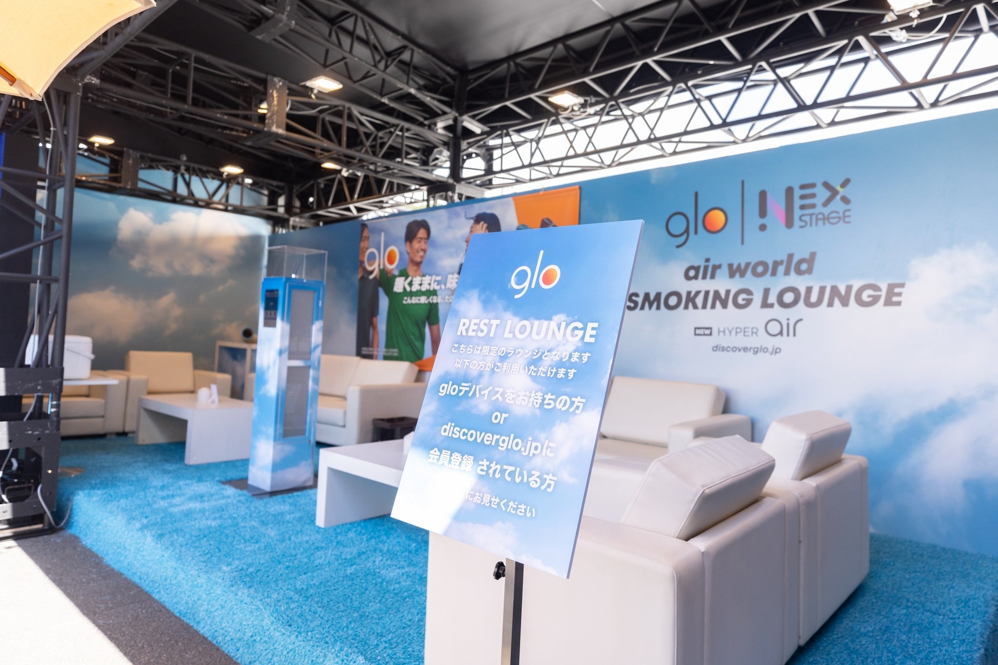 今回の「BLUE SKY HEAVEN 2023」目玉のひとつは、glo™がプロデュースした体験型喫煙ブース「air world SMOKING LOUNGE 」。爽やかな青空のパネルが目を引くブースはパラソルやミストなども設置されており、暑いなか涼を求める人で朝早くから賑わいを見せていました。