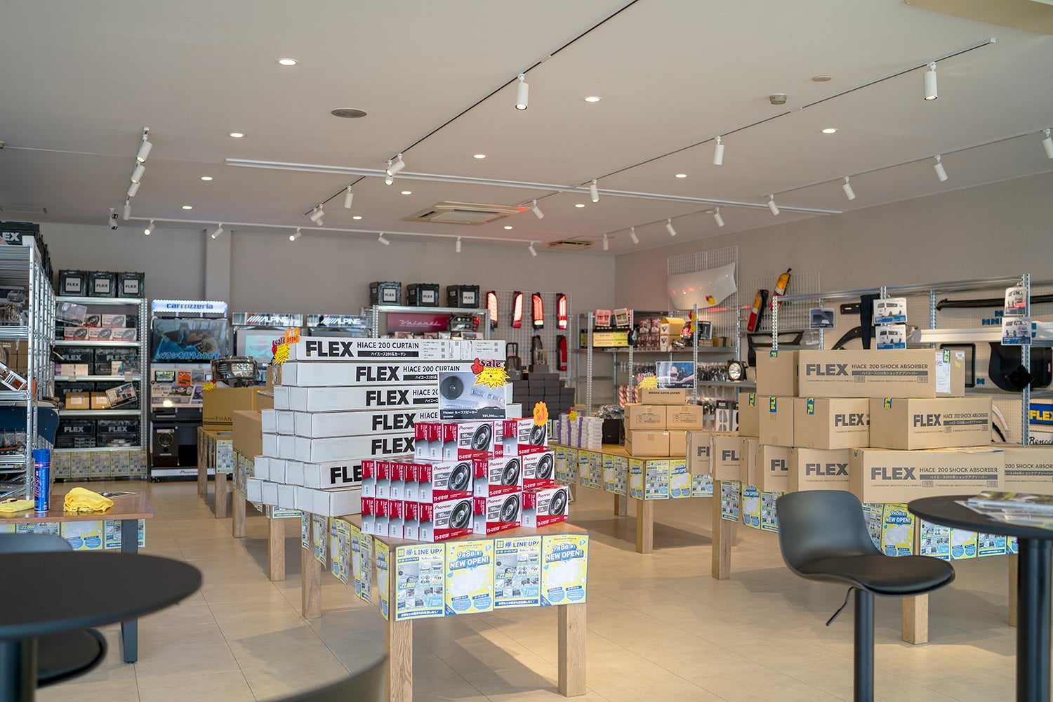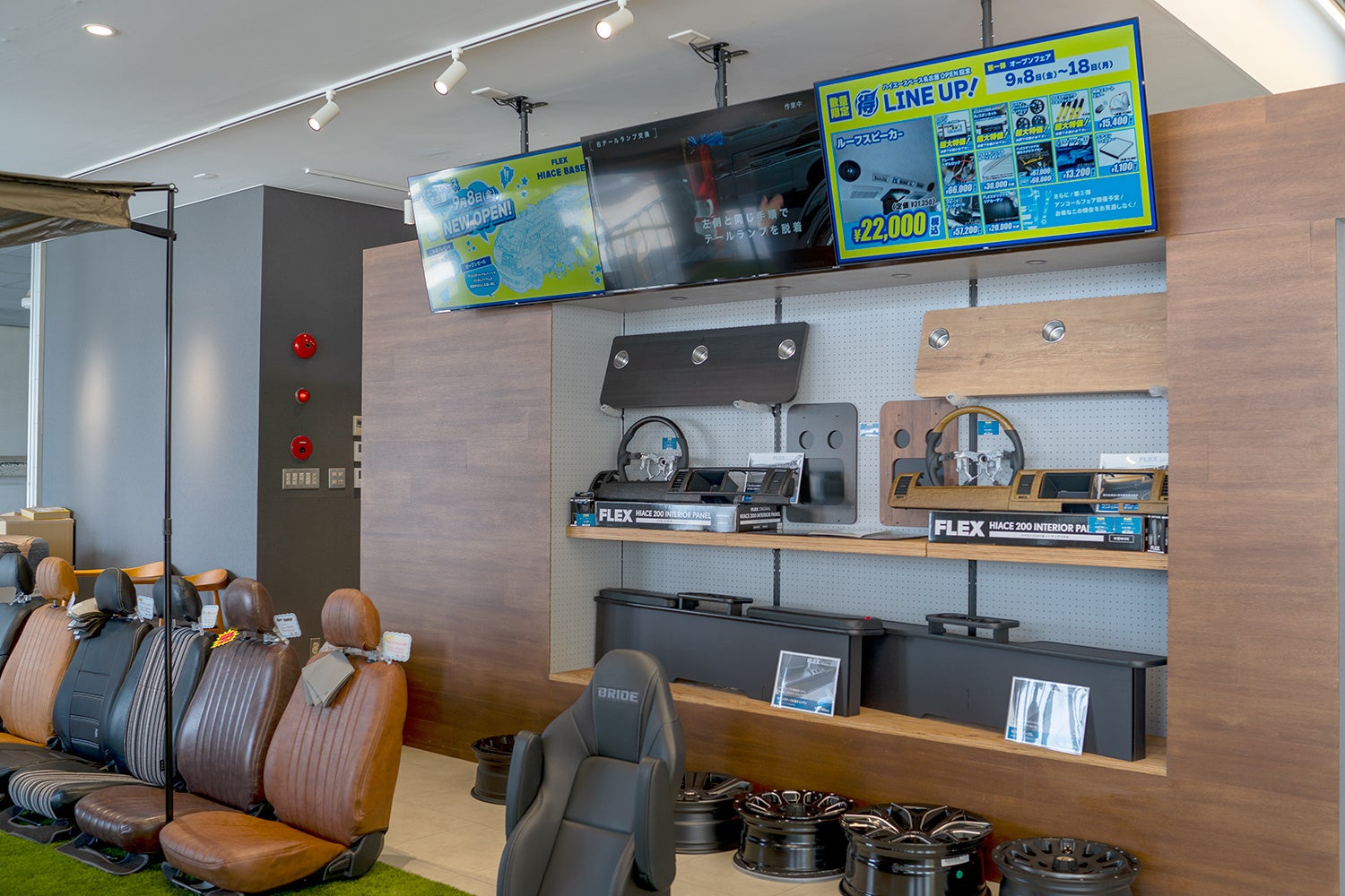 フレックスで購入されたクルマだけでなく、他社で購入したクルマでもご相談をいただけますので、「ハイエースのパーツの現物を見ながら比較して購入したい」「購入したパーツの取り付けもしてほしい」そんな方は是非ともご来店くださいませ。