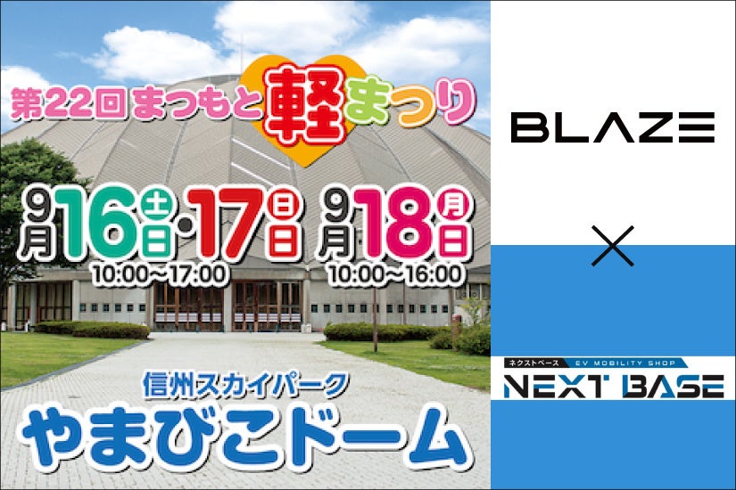 株式会社ブレイズ(愛知県名古屋市、代表取締役:市川秀幸、以下ブレイズ)は、2023年9月16日(土)から18日(月)の3日間、「やまびこドーム」において開催される、長野県内最大級のビッグイベント『第22回まつもと軽まつり』に、弊社正規ディーラーNEXT BASE(長野県松本市、代表取締役社長:平林佑樹、以下NEXT BASE)と合同出展いたします。