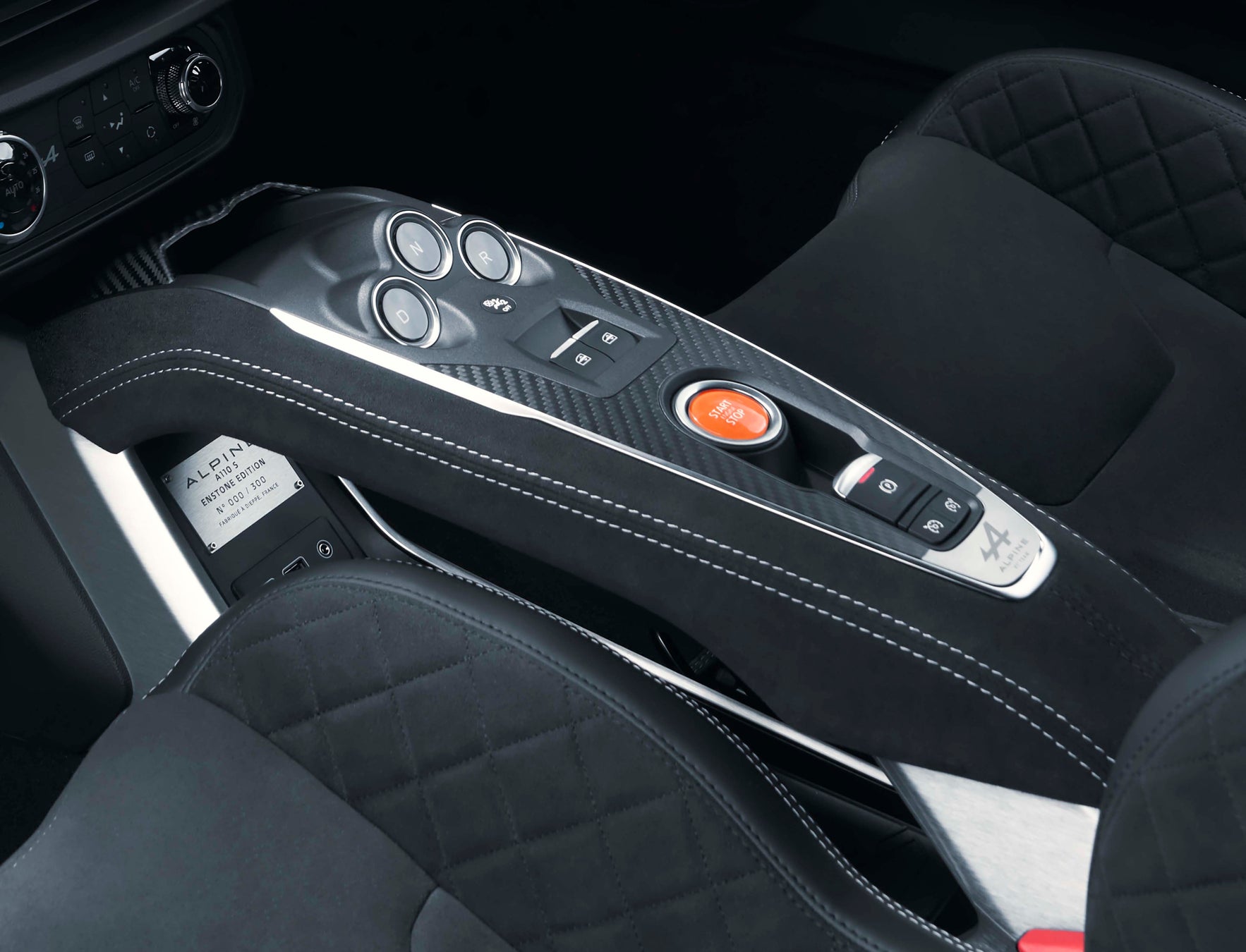 アルピーヌ A110 S エンストンは、エンストン工場が長年培ってきた、F1マシンには欠かせないカーボンパーツの高度な成型技術とノウハウを活用し、アルピーヌ F1マシンと同じカーボン素材を使用してエンストン工場内で製造されたメーターバイザーとセンターコンソールを、装備しています。