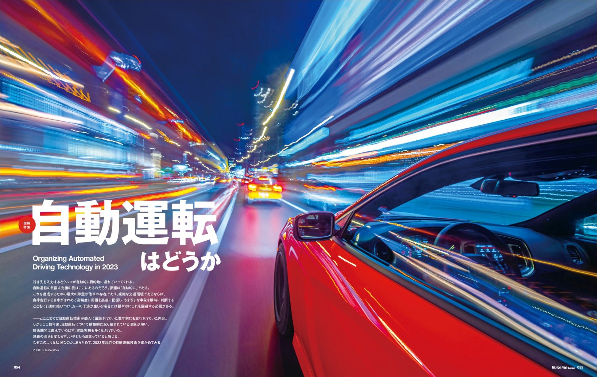 一方の特集。自動運転について、2023年現在の姿を捉えてみようと企画しました。ひところに盛り上がっていた自動運転技術が、このところ落ち着いてしまっている印象があります。先進運転支援機能:ADASがどんどん便利になっている昨今、自動運転技術との境が見えにくくなってきて、そのため相対的に目立たなくなっているのか——などとも思えますが、しかし今もこれからも、自動運転技術が重要な目標のひとつであることは疑いようがありません。