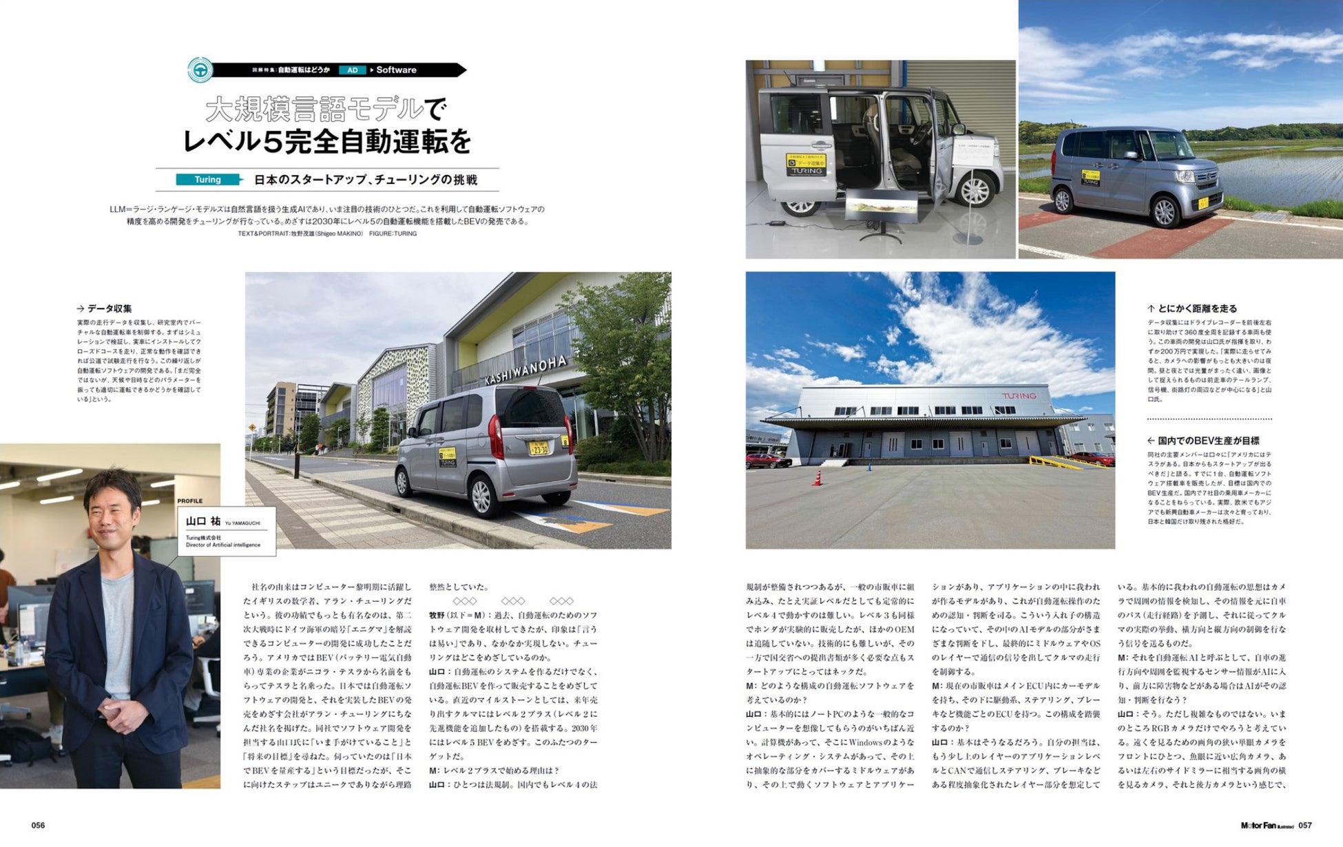 特集のトップバッターはTuring。次の自動車メーカーになることを目指し、さらに自動運転レベル5の市販車を目標に急ピッチで開発を進める企業です。自動運転開発の責任者を務める山口氏に詳しくお話をうかがいました。大規模言語モデルと自動運転がどうして結びつく?——という疑問にこれほど明快に答えてくれたのが非常に印象的です。