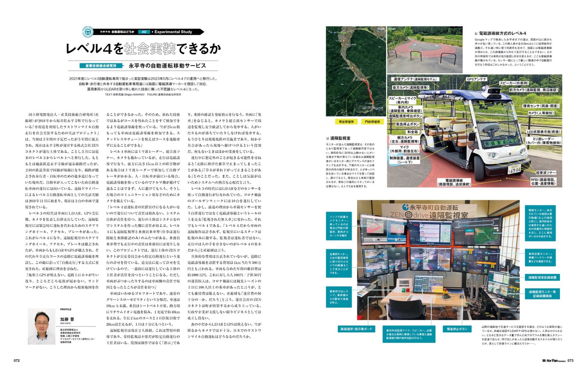 レベル4! システムが運転時の全責任を負うという、まさに「自動運転」としてふさわしい自動車です。永平寺で走行するレベル4の車両について、その構造と事業形態、これからレベル4はどのように進むのかを産業技術総合研究所の加藤氏にききました。