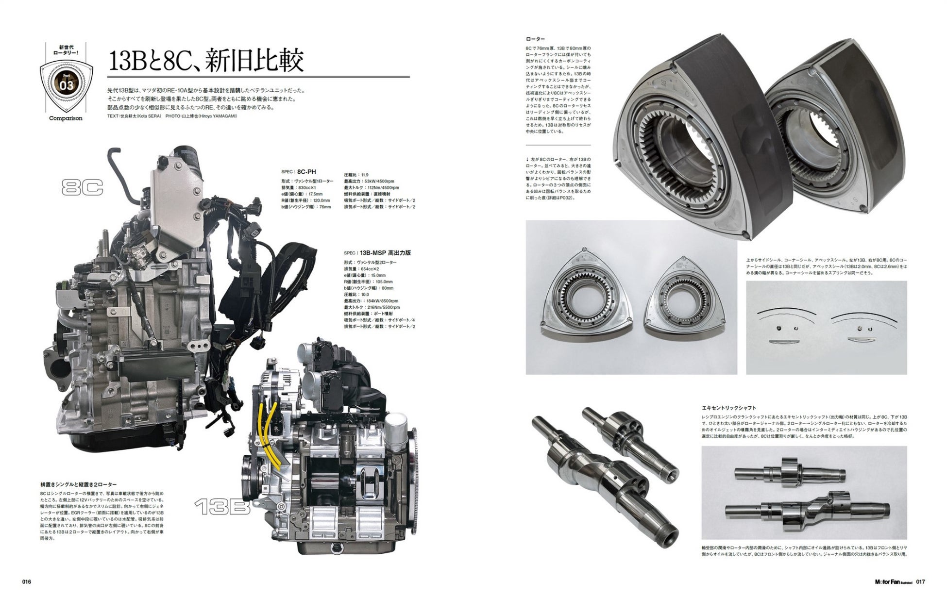 先代にあたる13Bとの比較。設計を完全に新しくした8C(じつは偶然にもかつての13A型とトロコイド形状は結果的に同一となったそうです)とを同じアングルで撮影、比べてみました。