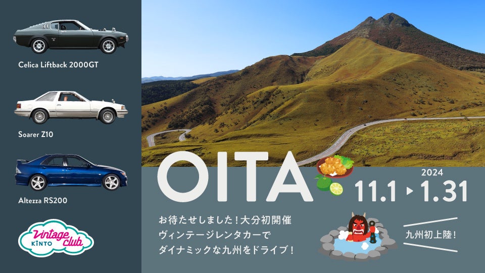 株式会社KINTO(本社:愛知県名古屋市、代表取締役社⻑:小寺 信也)は、旧車コミュニティ「Vintage Club by KINTO」で、各地でも好評を博している”旧車キャラバン”を、九州初進出となる大分で11月1日より開催いたします。