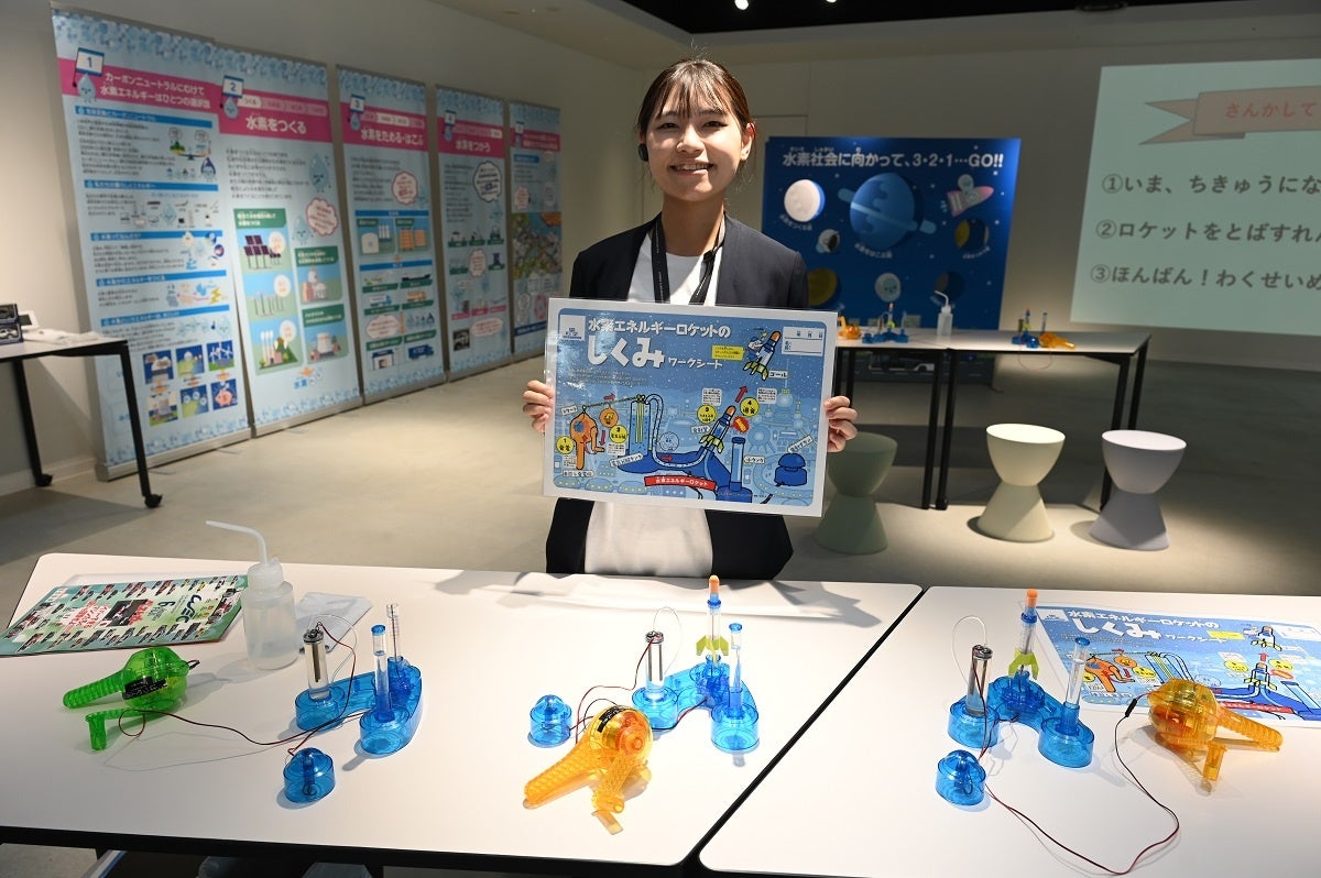 電池を使わずに手回しで発電。水から作った水素を爆発させてロケットを飛ばします。水素の量、発射角度などをコントロールして見事的に入ったら、素敵なプレゼントが当たるかも!