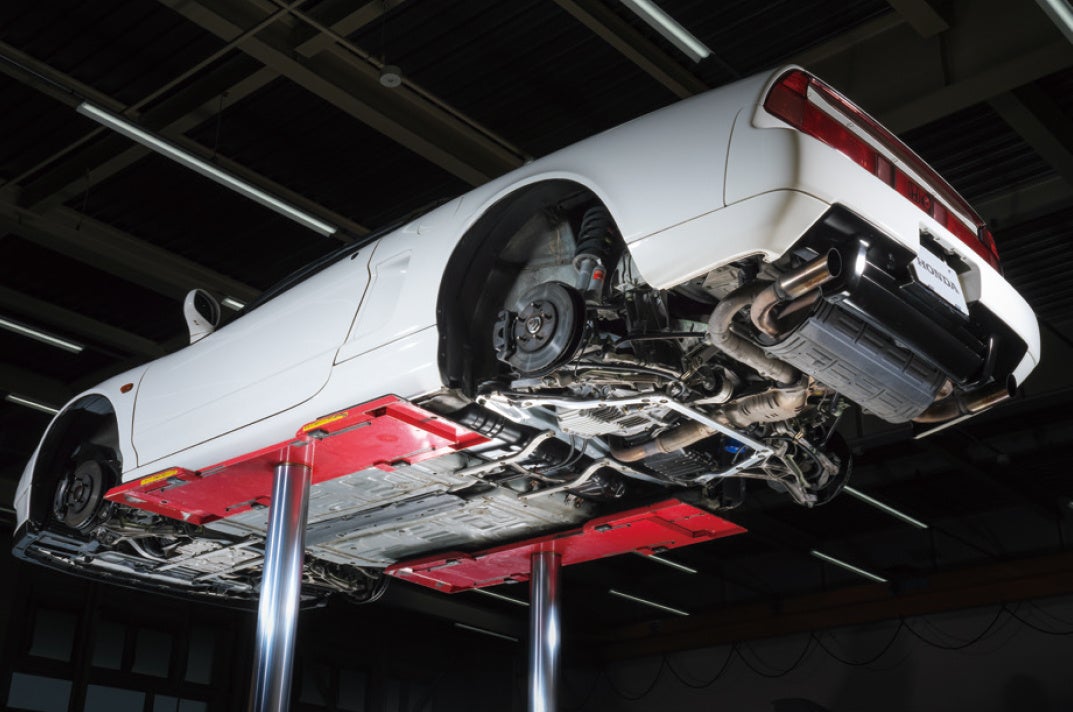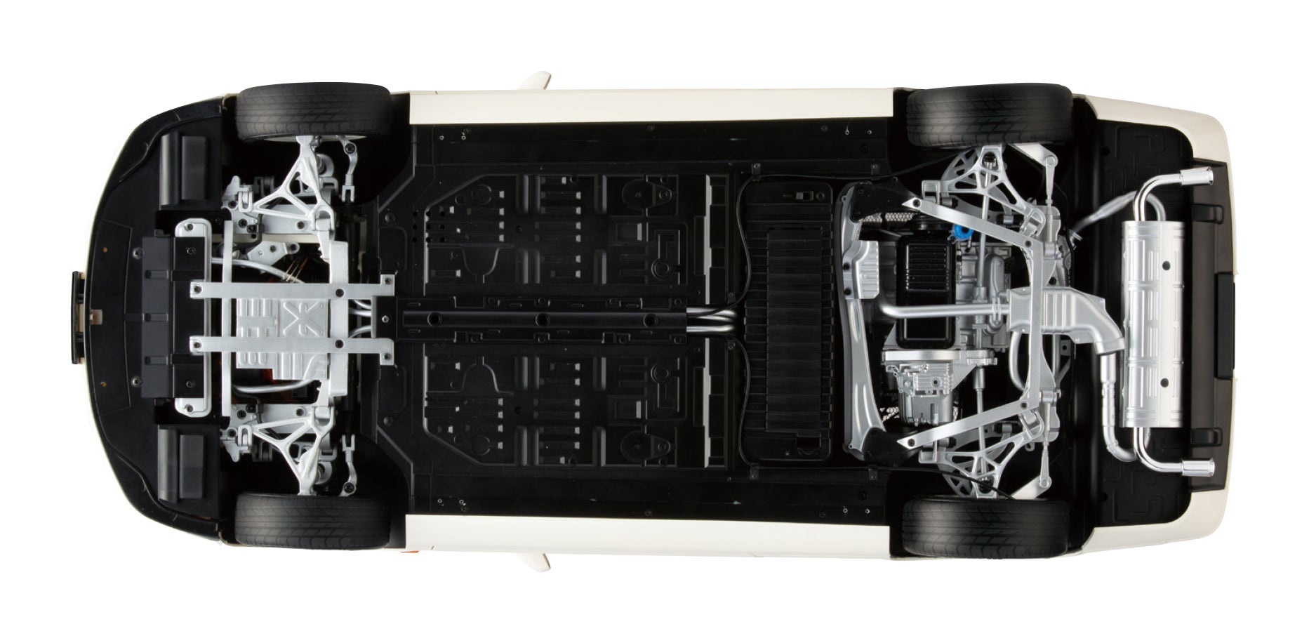 徹底した軽量化はボディ下面にも及び、NSX-Rのアンダーコートは省かれていた。モデルでは、普段は見えにくいボディ下面も忠実に再現。下面からはエキゾースト系のレイアウトやサスペンションの構造を見ることができる。