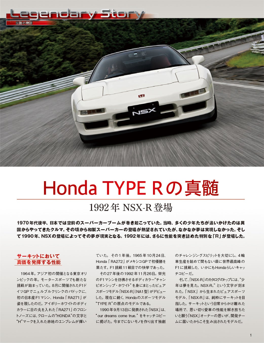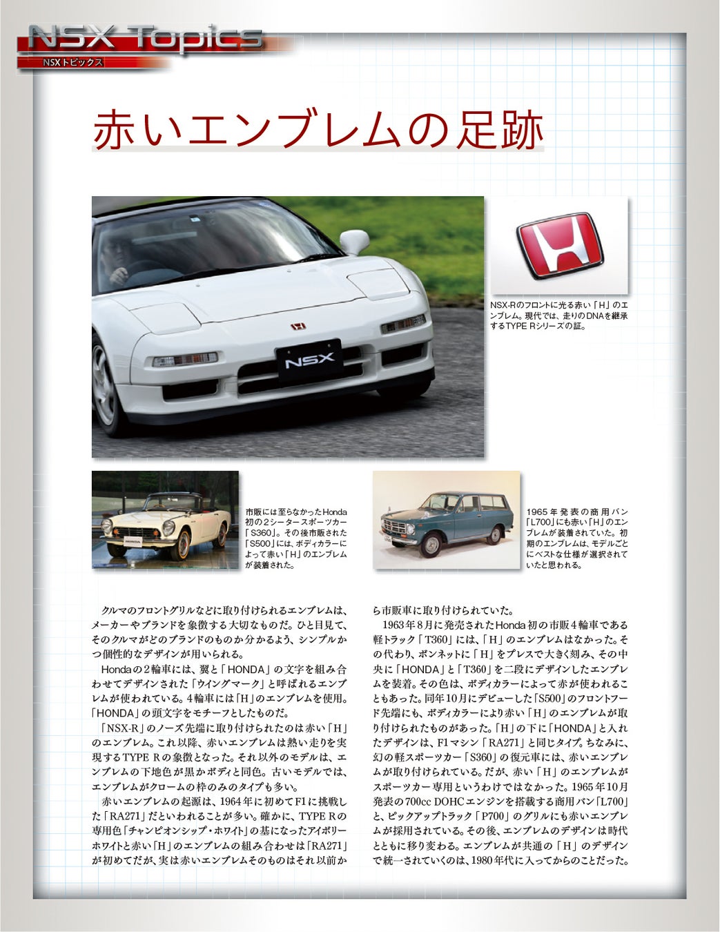 フロントのエンブレムやボディカラーなど、NSXにまつわる様々な話題を取り上げます。貴重なカタログを掲載し、歴代のTYPE Rも紹介します。