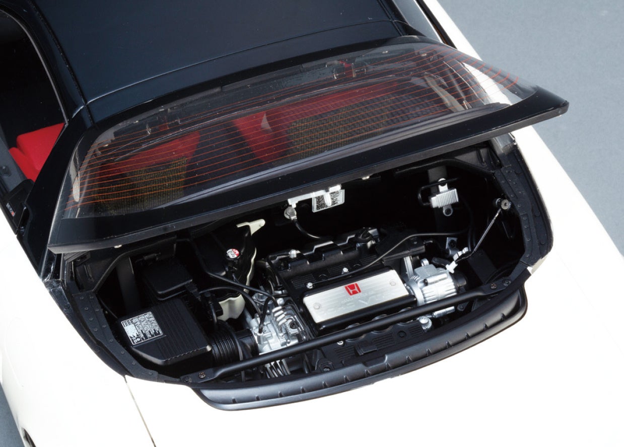 ガラスのハッチをあけ、さらにメッシュ状のエンジンフードを開くと、横置きにミッドシップマウントされた心臓部の3ℓV6VTECエンジンにアクセスできる。