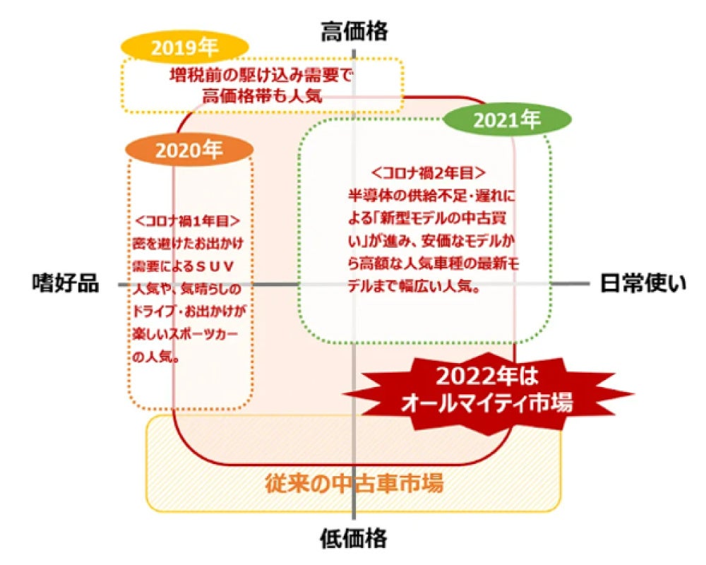 今年のランキングは、日常の移動手段、または趣味嗜好を反映する車など、購入動機に限らず「〇〇メーカーの〇〇モデルが欲しい!」といった特定モデルへの「指名買い」が反映された結果となりました。そのため、直近過去数年間のコロナ禍の影響を受けたランキングと比較すると、今年のTOP10は、幅広い使用用途と価格帯のモデルが並んでいます。昨年は「オールマイティ市場」(※図参照)とコロナ禍を脱し始めた中古車市場を表現。これは、消費者の車購入への検討幅が価格・使用用途の両軸で広がっていったことを指しますが、今年はその市場の中でも、とくに同じジャンルの中で特定の“モデル”が指名されていることが感じ取れます。