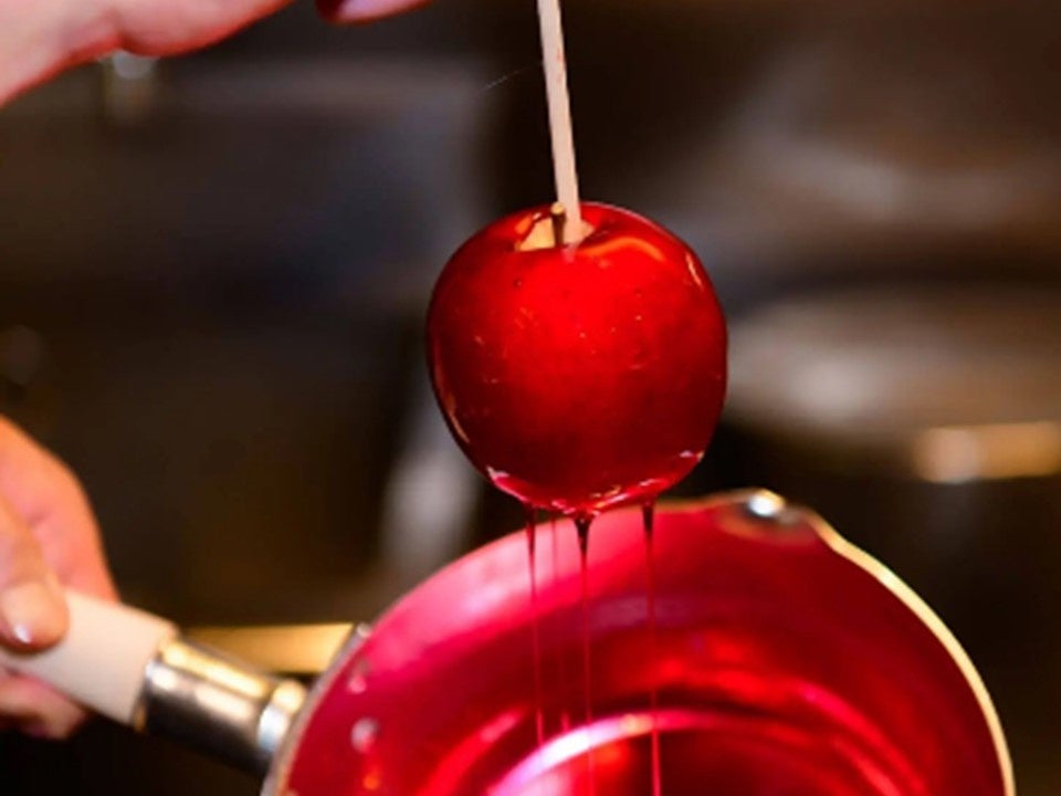 また飴は、りんごの食感と飴の食感に一体感が生まれるようにパリパリに仕上げ、口の中で一瞬で溶け混ざり合うよう薄くコーティングしています。そのため、甘みの中にりんご本来の酸味と甘い香りが口いっぱいに広がります。