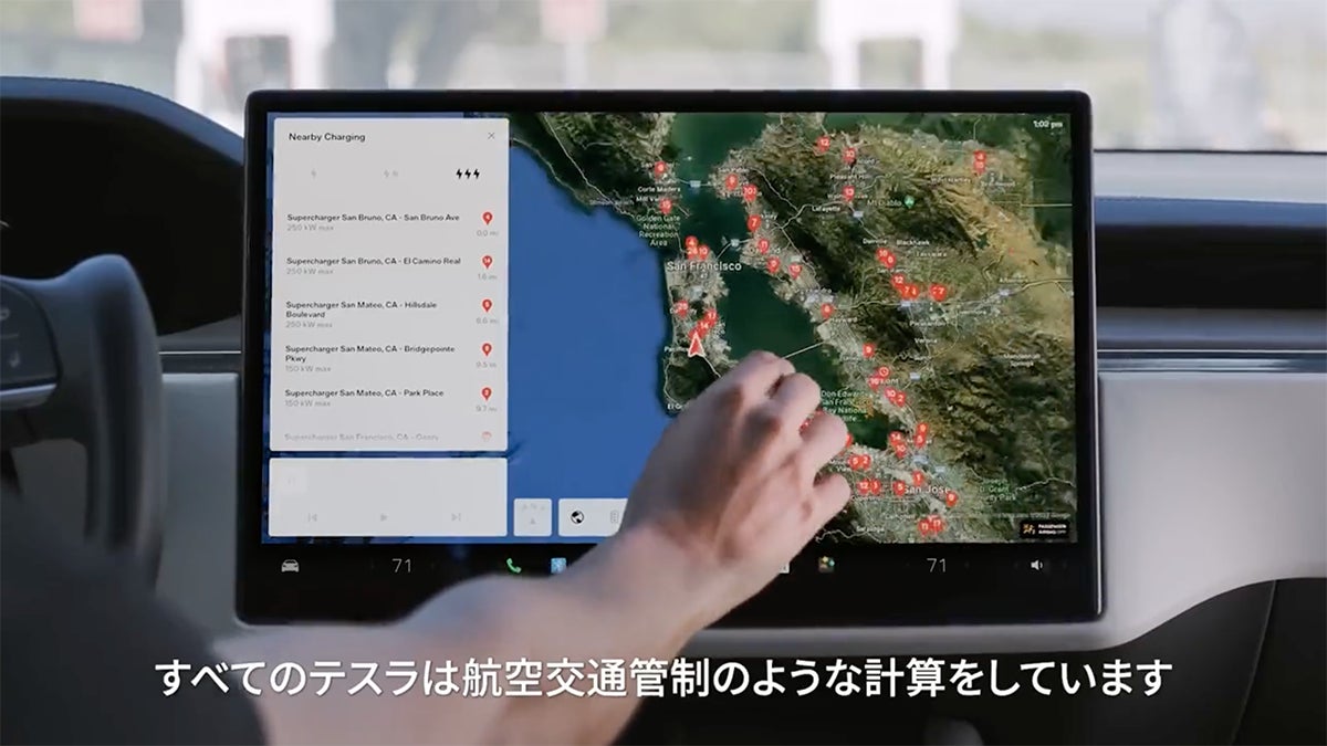 テスラの特徴的なタッチスクリーンに搭載されたナビゲーションシステムは、目的を設定すると、充電が必要な場合は、ルートにスーパーチャージャーを含むルートを表示します。また、一般的な交通状況を踏まえたルート計算の様に、スーパーチャージャーの利用状況も常に車両へ共有され、充電待ちなどが発生しづらいルートを計算し表示します。