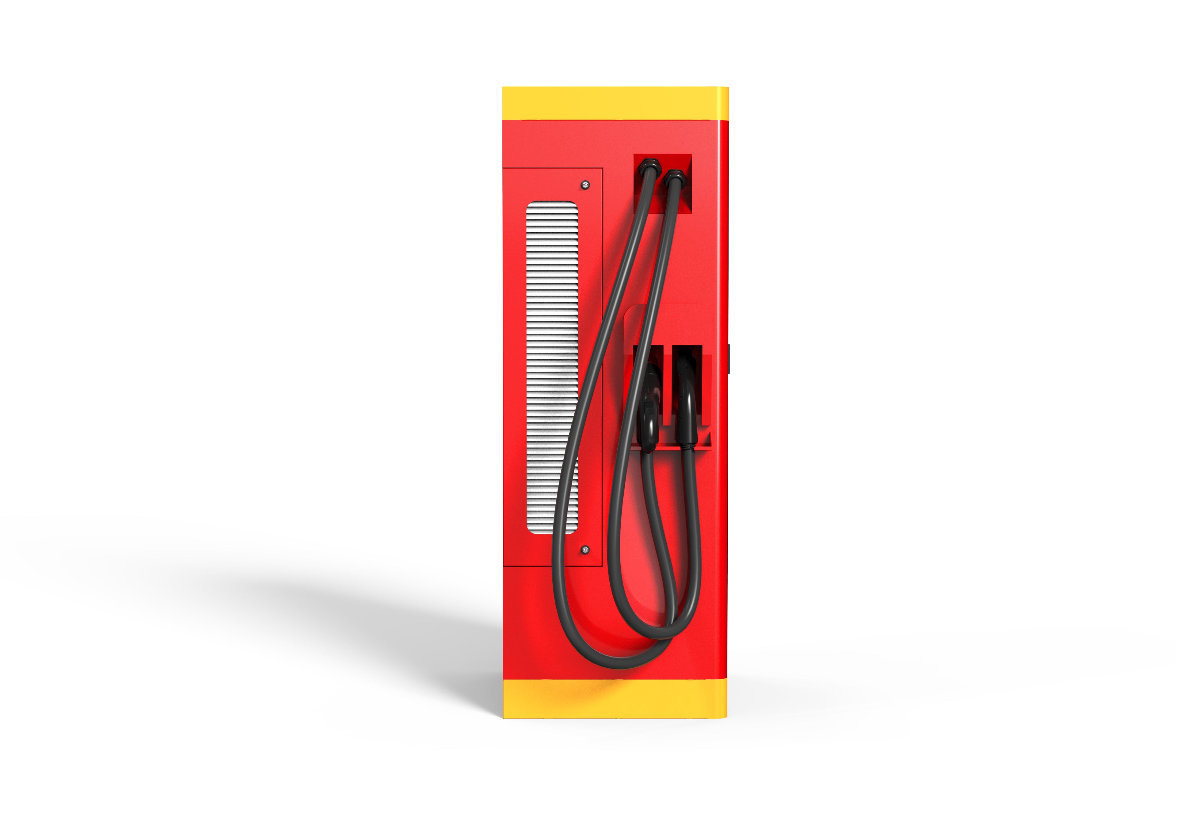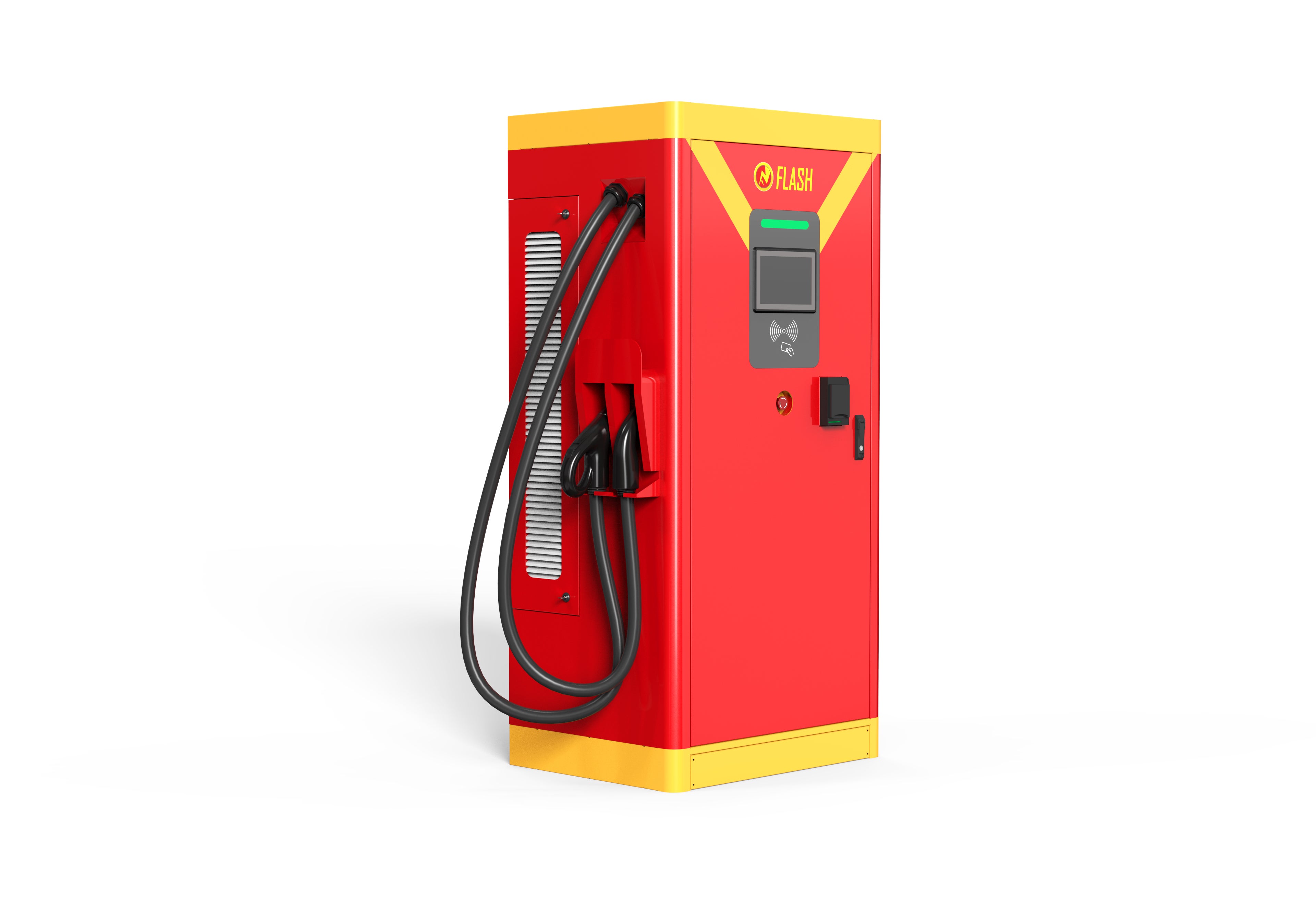 12/14にCHAdeMO認証を取得しました同モデルの「FLASH」では、敢えて2台同時充電できない仕様にすることで、2規格対応の急速充電器では国内最速の180kWhの速度を実現しました。そのため両側からではなく、片側から2本充電ケーブルが出ているのが特徴です。