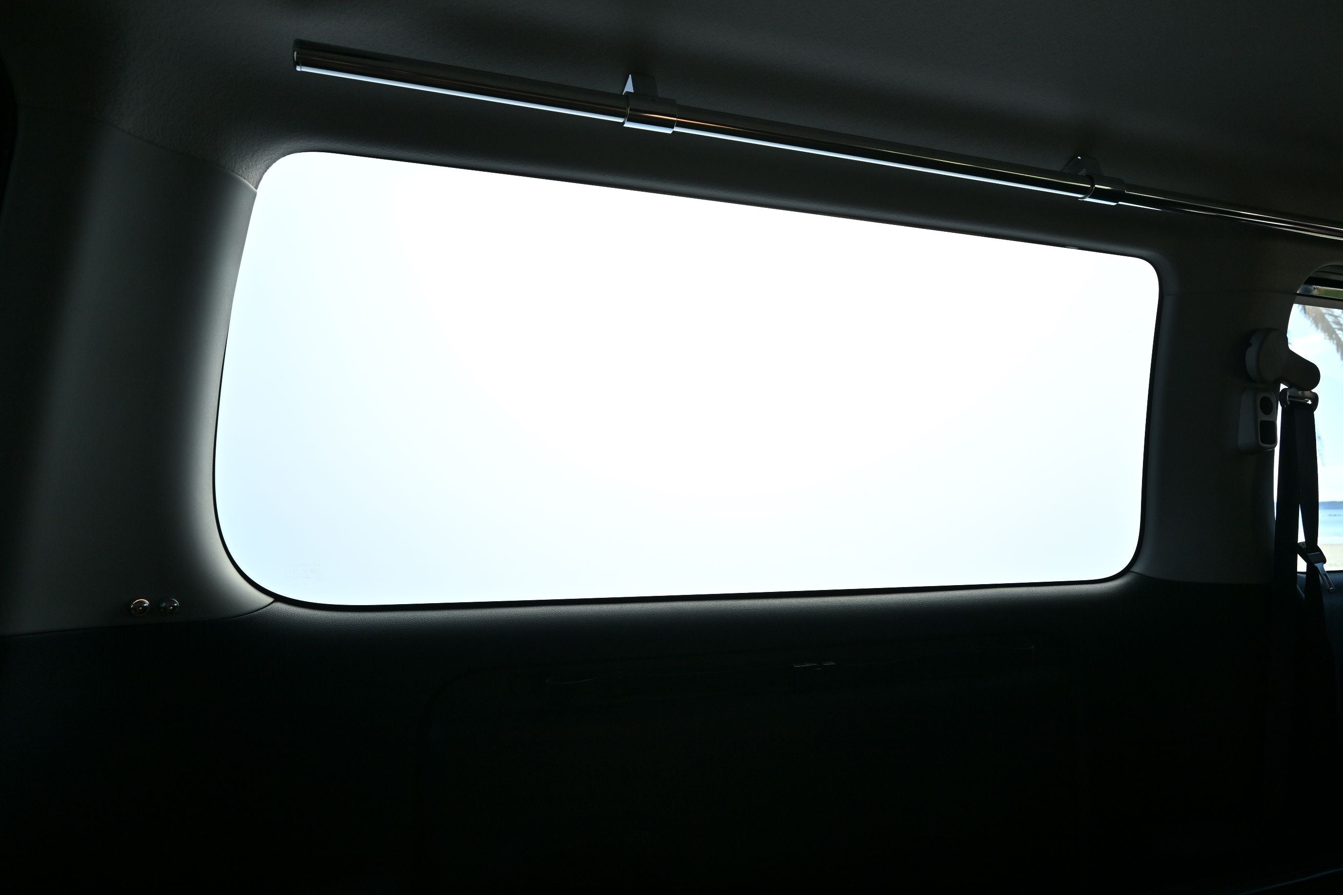 オグショーが長年培ってきた多様なアレンジ機能を持つベッドシステムを主軸に、車中泊がより快適になる調光フィルム<オグショー商品名|エレクトロニック シェード>をバックドアのリアウィンドウガラスへ搭載しました。