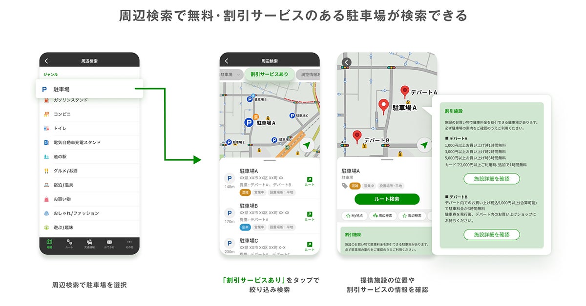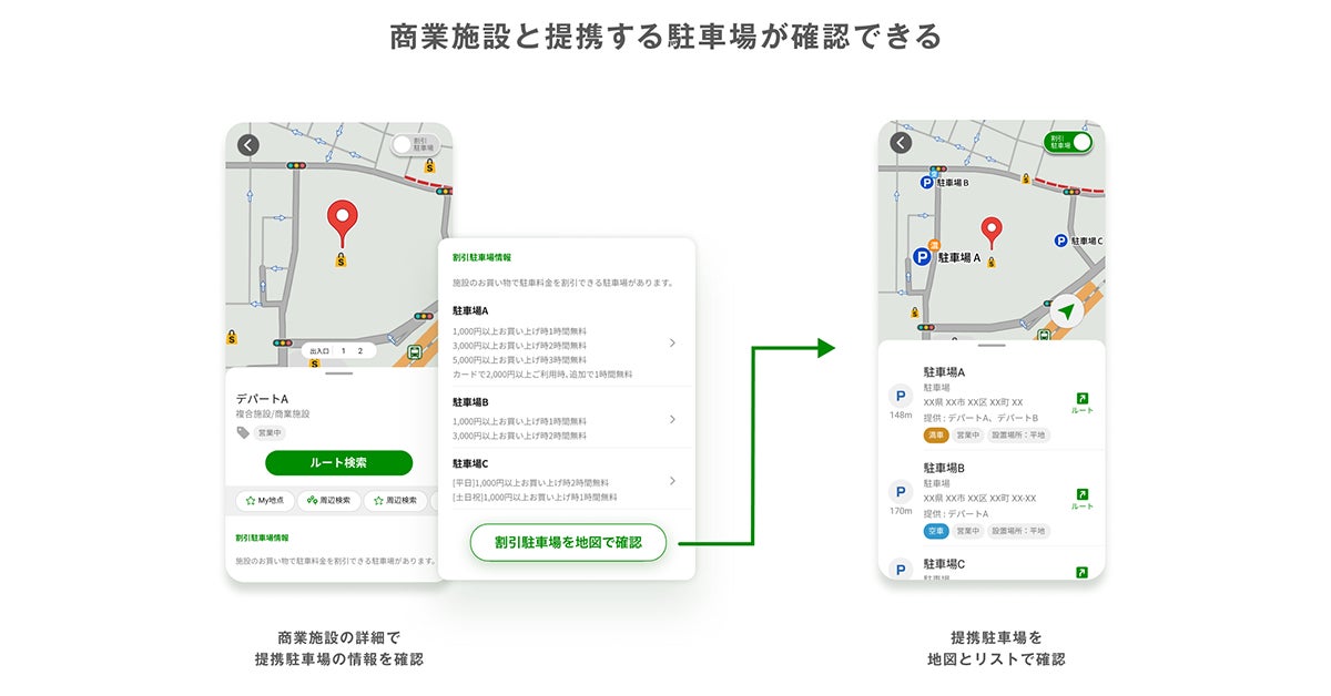 また、商業施設を検索した際にも、地点詳細情報にて割引となる駐車場のリストと、割引条件の詳細を確認できます。