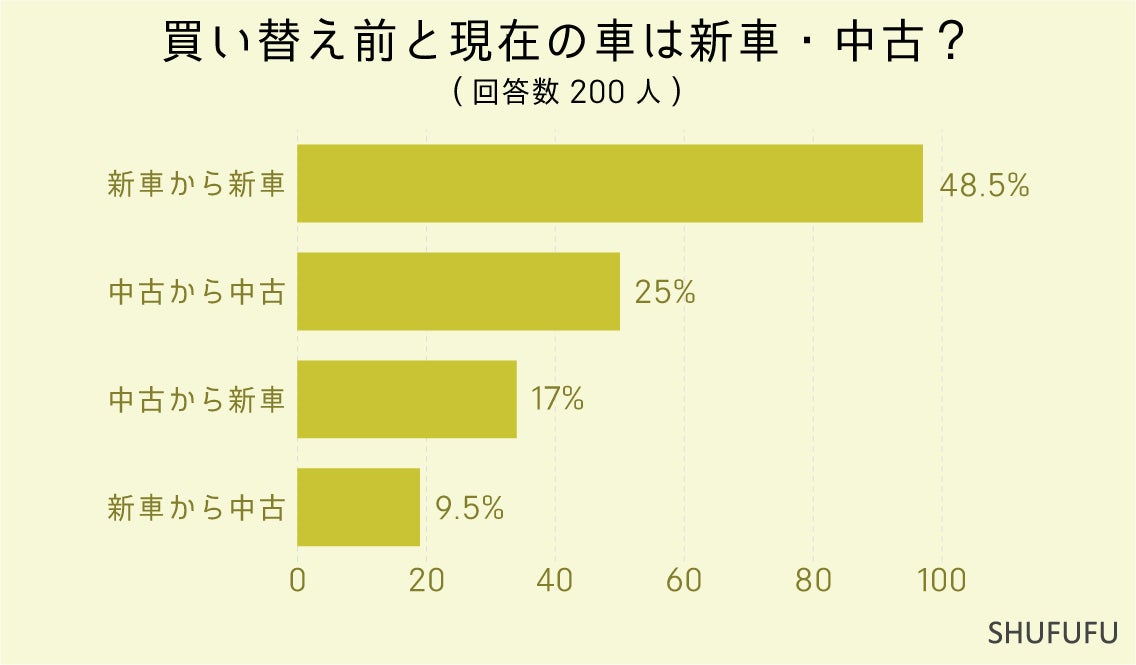 「買い替え前と現在の車は新車・中古?」の質問に関しては1位「新車から新車(48.5%)」、2位「中古から中古(25%)」でした。新車を買った人は次も新車、中古を買った人は次も中古と同じ状態の車を買う傾向が高いようです。