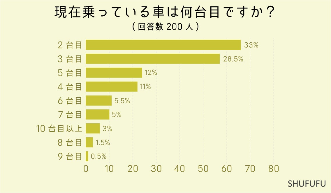 現在乗っている車は何台目ですか?の問いに対して最も多かったのが「2台目(33%)」でした。 次いで「3台目(28.5%)」「5台目(12%)」という結果でした。買い替えを経験したのが一度か二度の人が半分以上になりますね。