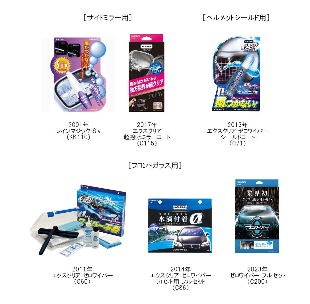 株式会社カーメイト(本社:東京都豊島区)は、ガラスに雨が付かない超撥水ガラスコート「ゼロワイパー」シリーズより、「ゼロワイパー フィルムタイプ サイドミラー用(C204)」を4月8日(月)に発売しました。本製品は超撥水構造を施したフィルム(以下、超撥水フィルム)を採用し、従来の超撥水コート剤よりも接触への耐久性を強化しました。超撥水フィルムは、「JAPAN MOBILITY SHOW 2023」に参考出展した際、来場者からご高評をいただき、この度の発売に至りました。詳細は以下をご確認ください。