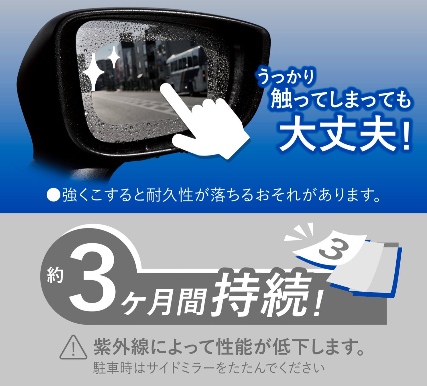 本製品をサイドミラーに貼ることで、停車中(0km/h)も雨を弾きます。風があたりにくいサイドミラーでも雨粒が残らず、後方を見やすく保ちます。