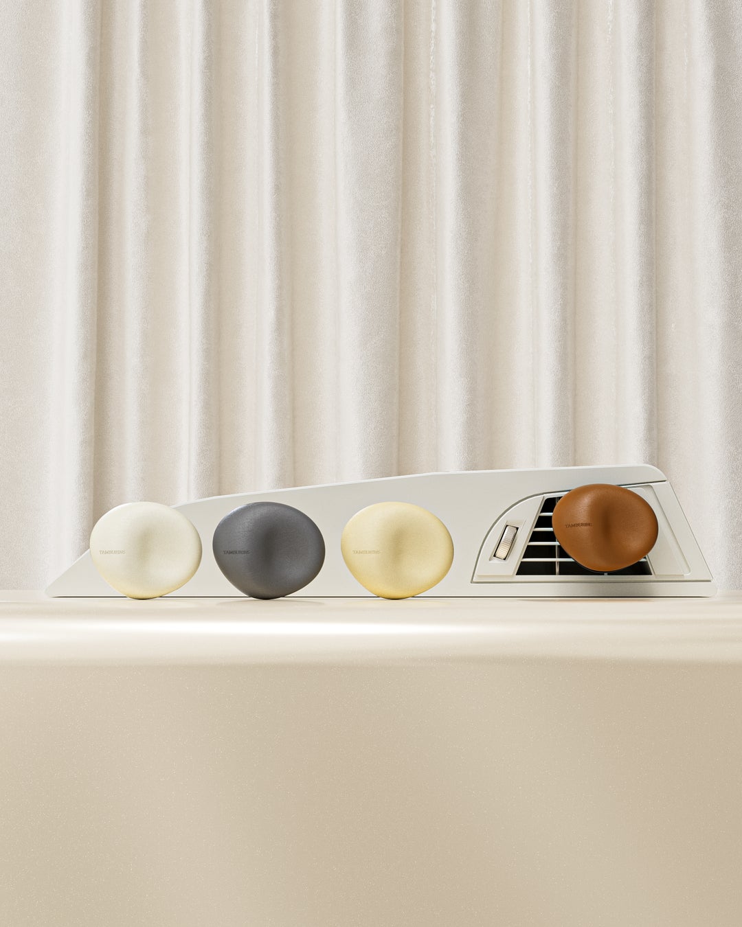 柔らかい革で包まれた流麗なさざれ石のようなシェイプと笑ったときにできる丸いえくぼを連想させる感覚的なデザインが際立つタンバリンズのカーディフューザーは、詰め替えカートリッジタイプで半永久的に使用できる香り調節も可能な「カーディフューザー(8g)」と、一体型で製作されリーズナブルな価格で製品を体験できる「カーディフューザーミニ(4~5g)」の2つのタイプで発売されます。
