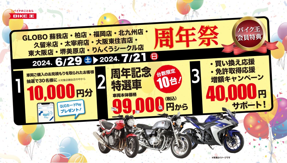 【バイク王】6月29日(土)より、千葉・九州・大阪エリアで周年祭開催!