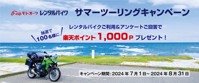 循環型マーケットデザインの株式会社オークネット(本社:東京都港区、代表取締役社長CEO:藤崎 慎一郎、以下:オークネット)の子会社である株式会社オークネット・モーターサイクル(本社:東京都港区、代表取締役社長:福田 博介、以下:オークネット・モーターサイクル)は、レンタルバイクサービス「モトオークレンタルバイク」をご利用およびアンケートご回答者の中から抽選で100名様に、楽天ポイント(1,000ポイント)が当たる「サマーツーリングキャンペーン」を2024年7月1日(月)から実施いたします。夏の海や山へのツーリングにレンタルバイクを利用するきっかけにつながれば幸いです。