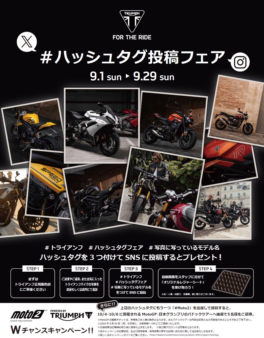 トライアンフモーターサイクルズジャパン株式会社(代表取締役社長:大貫 陽介 – 東京都港区) は、9月1日(土)~9月29日(日)までの期間中、初秋のキャンペーンとして全国のトライアンフ正規販売店にて「#ハッシュタグ投稿フェア」が開催中であることをお伝えします。