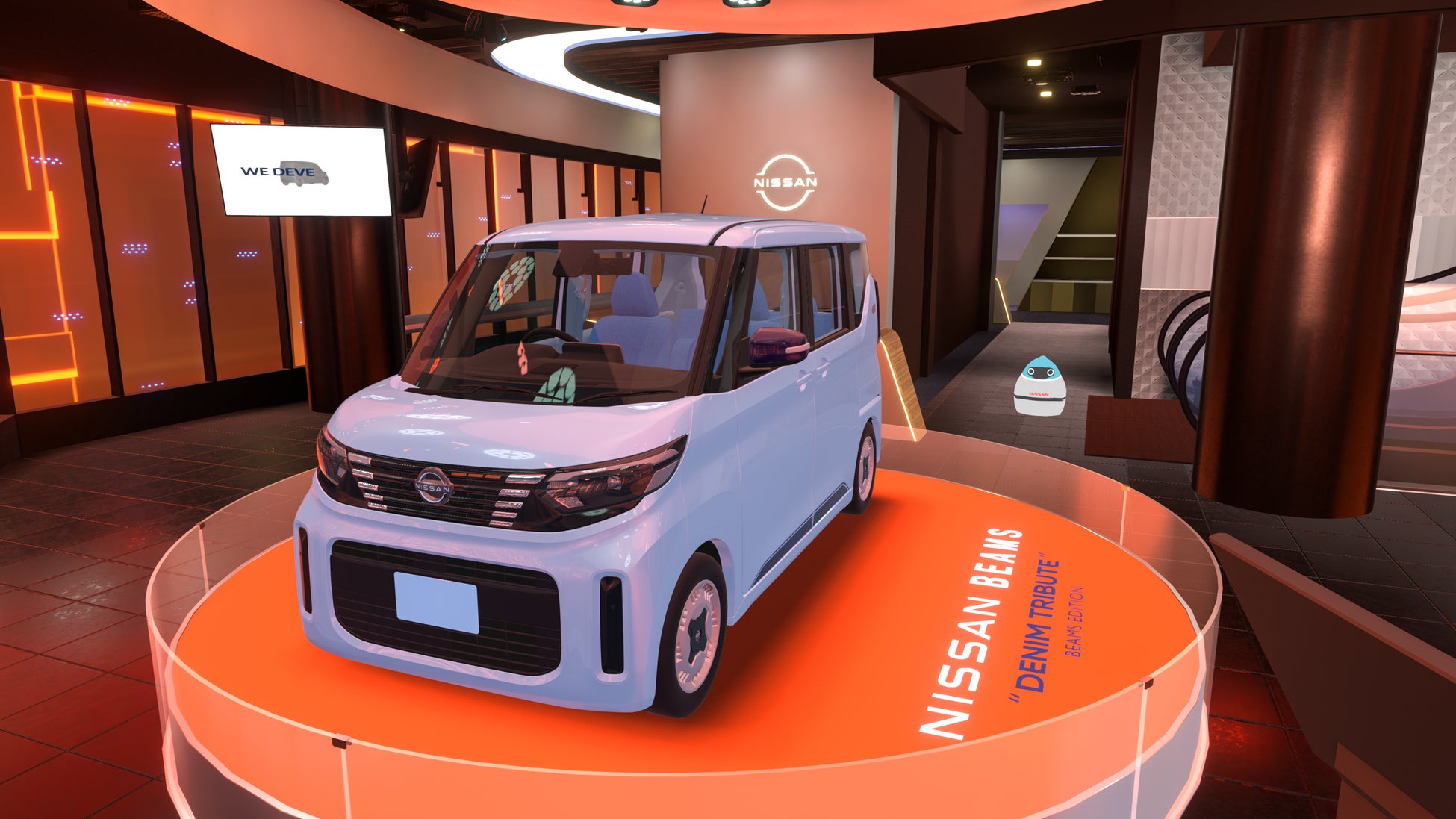 このVRギャラリーは、日産が銀座にて実際に運営するギャラリーを忠実に三次元化し、ワクワクを体感できる日産のVRワールドの中で、最もアイコニックなワールドです。ソーシャルVRサービスの「VRChat」を利用する皆さまが自由に訪れることが可能で、今回のリニューアルにより銀座の街並みをネオンのアウトラインで表現し、建物内の装飾もアップデートしました。また、ビームス監修の特別仕様車「ビームス エディション」6車種の中から、「日産サクラ」「ルークス」「エクストレイル」を展示します。