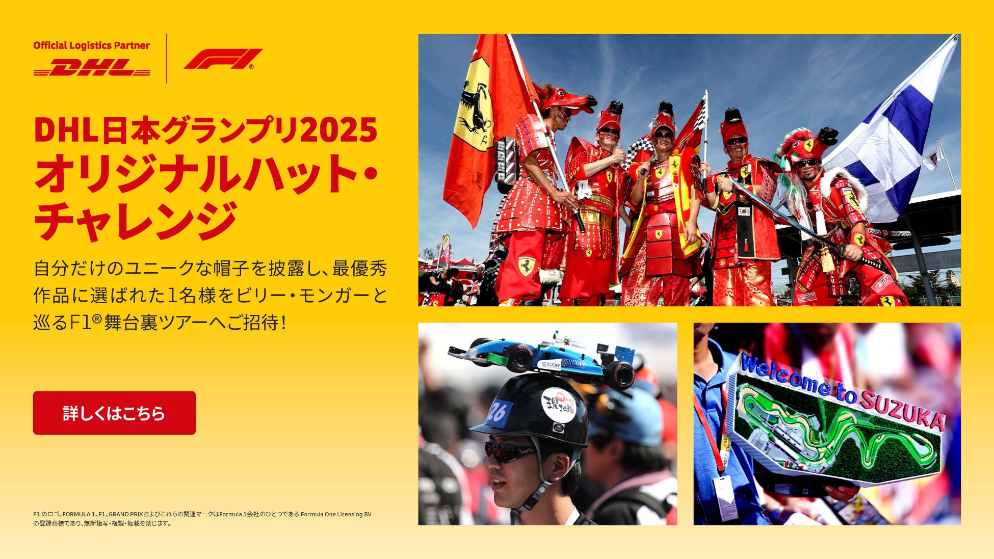 国際エクスプレスとロジスティクスのグローバルリーダーであるDHLは、2025年4月5日(土)~6日(日)に三重県鈴鹿サーキットで開催されるフォーミュラ1®(F1)日本グランプリにおいて、特別企画「DHL オリジナルハット・チャレンジ」を開催します。F1を20年間ロジスティクス面で支えてきたDHLが、日本のF1ファンの皆さんに、心に残る忘れられない瞬間をお届けします!コンテストへの参加方法は、DHL.InMotion.でご覧いただけます。