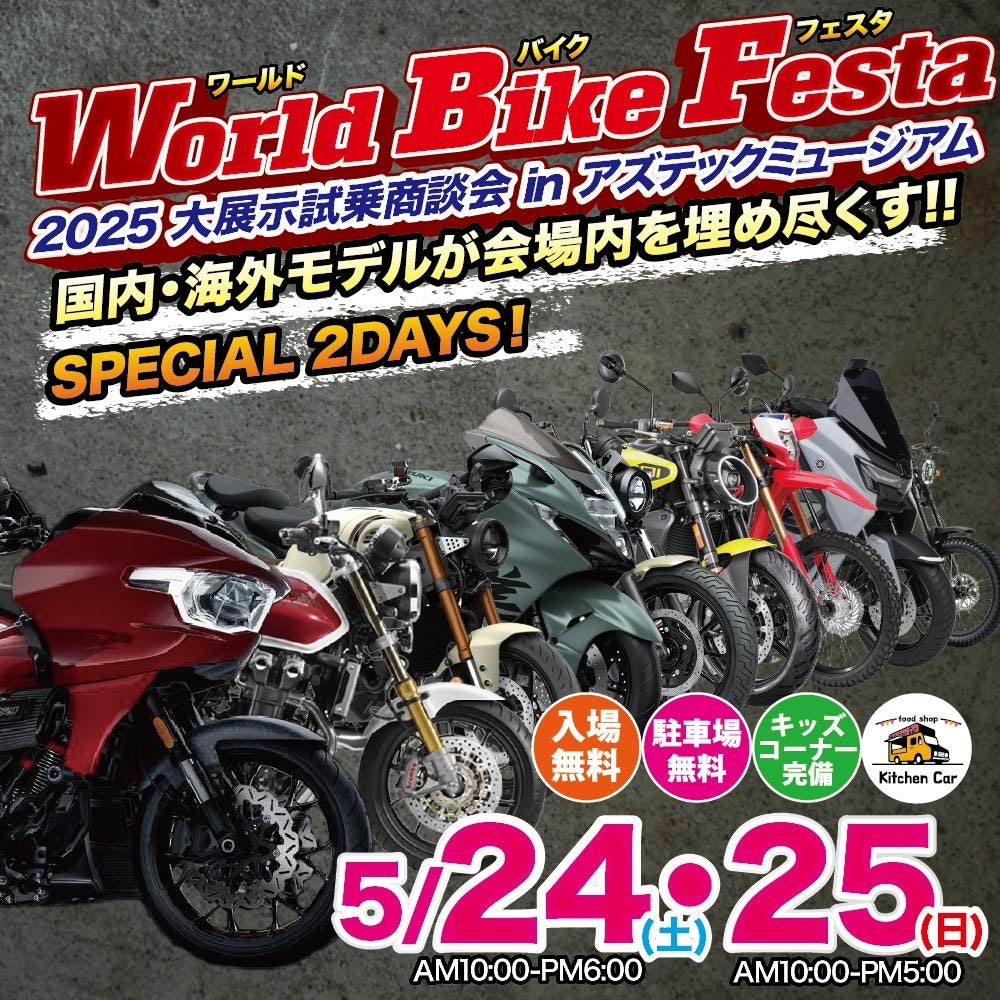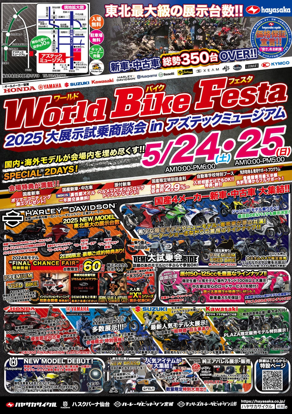 オートバイ・自転車を販売および修理する「ハヤサカサイクル」を運営する株式会社早坂サイクル商会(本社:宮城県仙台市、代表取締役:早坂 武)は宮城県仙台市太白区にあるイベントホール アズテックミュージアムにて、東北最大級のバイクイベント「World Bike Festa」を2025年5月24日(土曜)、25日(日曜)に開催します。